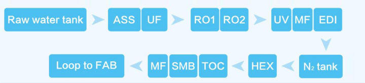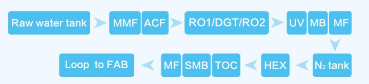 工藝特點(diǎn):水中大部分的鹽分采用反滲透方式去除,后段采用MB系統(tǒng)制取高純水,可有效的延長MB系統(tǒng)的再生周期,減少酸堿的使用量。